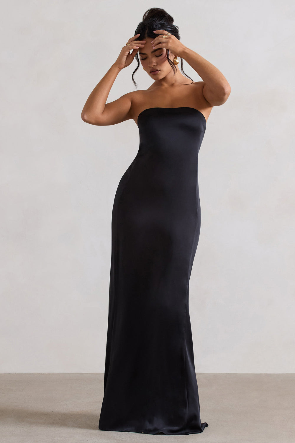 Showcasing a silhouette of pure timeless elegance is Azra. This maxi dress arrives in staple black shade of a premium flowing satin and boasts a simple strapless neckline, with an internal boned corset for added structure. Style this minimalistic maxi with some simple gold accents to complete your look.