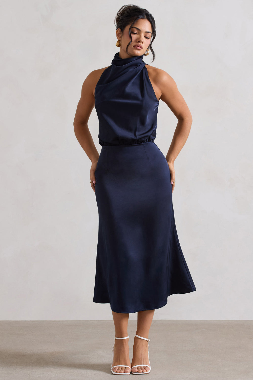Whether you're attending a wedding reception or graduation ceremony, Geena was made for special moments. Crafted in a silky satin fabric in a rich navy hue, this midi dress is defined by a draped high neckline and flattering tucked waist.