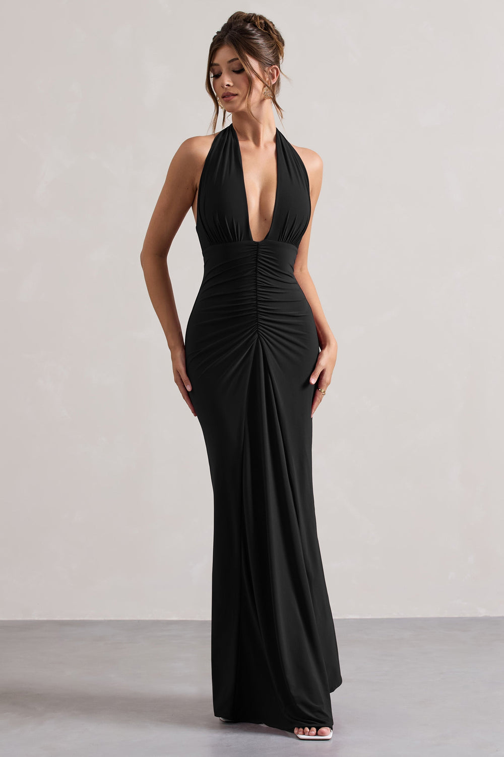 A simple modern silhouette that's perfect for the upcoming occasion season is Payton. Cut in a rich black shade of our sculpting stretch jersey, this maxi dress is ruched in all the right places for an ultra flattering fit. Style Payton with a tousled bun to show off the elegant self-tie halter neck.