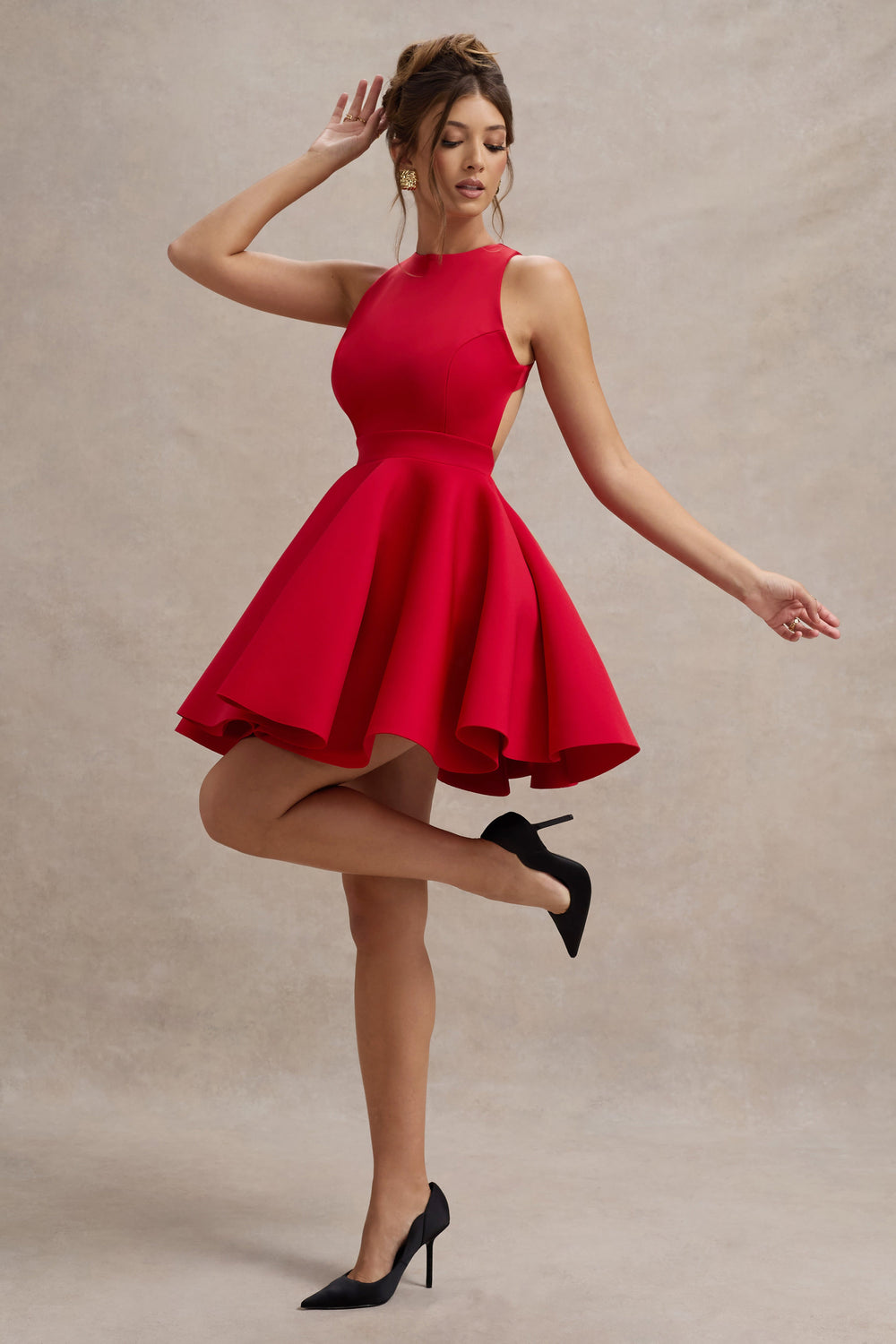 Named Waverly after its flouncy skater skirt, this red mini is on everyones wish-list this season. Boasting a self-tie racer neckline and sultry open-back, Waverly is the epitome of a new season silhouette. Compliment yours with some strappy stilettos and gold accents during your next getaway.